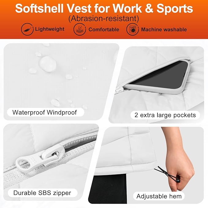 - Stylish and comfortable warming experience - Our ladies heated vest is stylish and slim-fit, combining warmth and fashion. Made from lightweight, waterproof, and windproof fabric with a smooth SBS zipper and soft lining for comfort and protection. The women's heated vest features 2 oversized pockets for essentials, an adjustable hem for a custom fit, and a machine-washable design with a laundry belt to prolong garment life