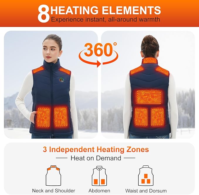 • INSTANT WARMTH & LIGHTWEIGHT - 8 ultra-slim carbon fiber heating elements of heated vest women quickly generate even and continuous heat at the neck, shoulders, abdomen (under two pockets), back and waist, ensuring your body core and hands are warm and comfortable without wearing heavy clothes.Come and try this womens heated vest,you will feel unprecedented warmth and lightness