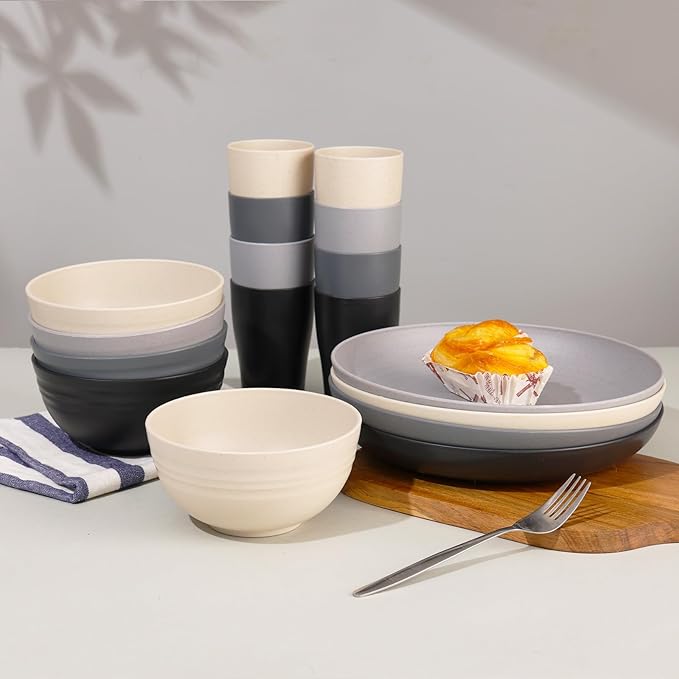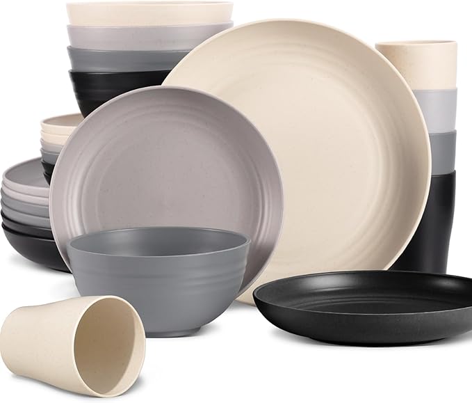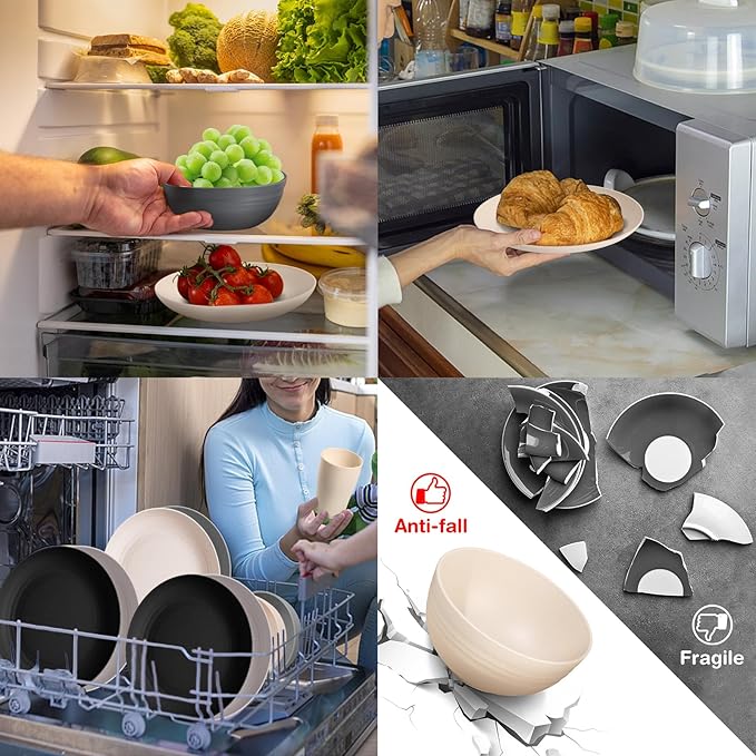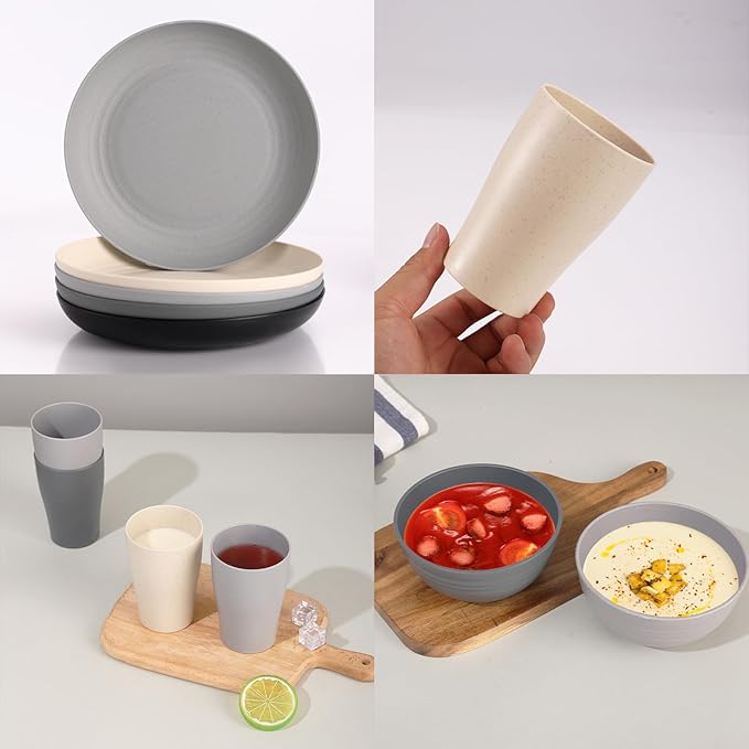 - 【Wheat Straw Dinnerware Sets for 8】32pcs wheat straw plates and bowls sets(black,dark gray, light gray, beige), including 8 wheat straw plates 9.8in, 8 wheat straw dinner plates 7.8in, 8 plastic cereal bowls, 8 wheat straw cups. Plastic plate and bowl sets are are reusable, you can reduce plastic waste and contribute to a sustainable lifestyle.