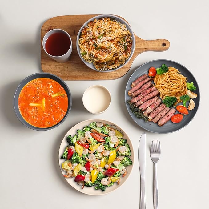 - 【Microwave Safe and Dishwasher Safe】Microwave safe plates and bowls sets are made from natural organic wheat straw and food grade PP. 100% BPA free, gluten free, non-toxic, safe and hygienic. You can safely heat food in the microwave without worrying about harmful chemicals seeping into the food. These dishes are dishwasher safe so cleanup is a breeze. They can also be used to store leftovers in the refrigerator.