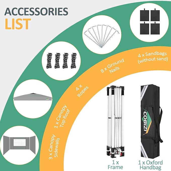 - 【Complete Accessories】The 10x10 pop up tents for camping comes with a variety of accessories: 10x10 canopy top, sturdy aluminum alloy steel frame, 4 sandbags, 8 round stakes, 4 ropes to ensure wind resistance, and 3 removable canopy tent sidewalls which give you more options when set up. To extend the lifespan of outdoor canopy, we recommend using the pop up gazebo on calm days without heavy rain or strong winds.