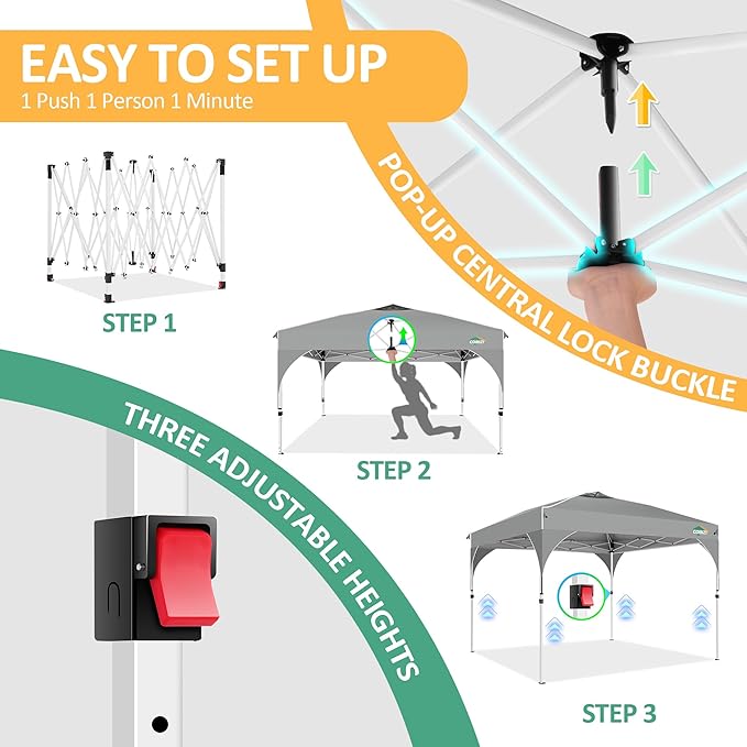 - 【Convenient Cenetral Lock】Canopy tent’s convenient central lock function allows for quick setup and takedown with a single push. The pop up tent can be easily installed by one person in just one minute, saving you time. If you have any trouble or questions about setting up or the pop up canopy, feel free to get in touch with us anytime.