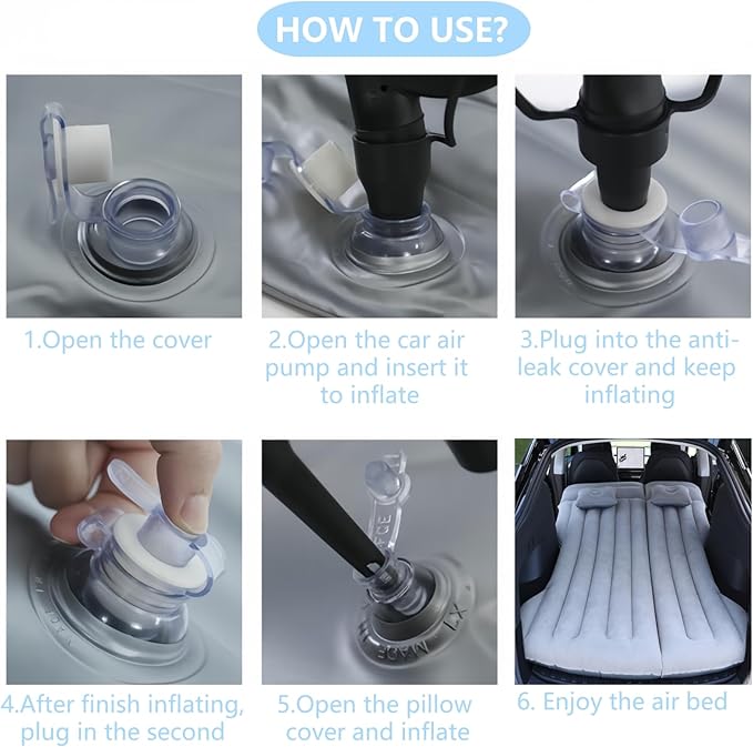 - EASY TO INFLATE/DEFLATE AND CARRY: The blow up mattress / car bed mattress can be inflated the camping bed quickly within 2-3 minutes. When you no longer use it, you can quickly deflat and fold the air mattress, it can be easily stored in the handbag easy to carry and does not take up space. It is an ideal car sleeping mat, camping mattress pad or car inflatable bed. Perfect for night driving or overnight fishing, enjoying movie time, self-driving travel , and camping in outdoor tents.