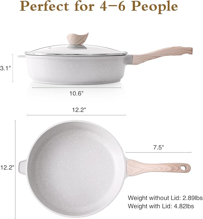 - 【Versatile Saute Pan with Lid】: Experience the convenience of our 12" diameter, 3.2" height, and 5 quarts capacity ceramic cookware; this large and deep skillet, also functioning as a deep frying pan and induction frying pan, is perfect for stir-frying, frying, boiling and deep-frying a variety of dishes with ease
