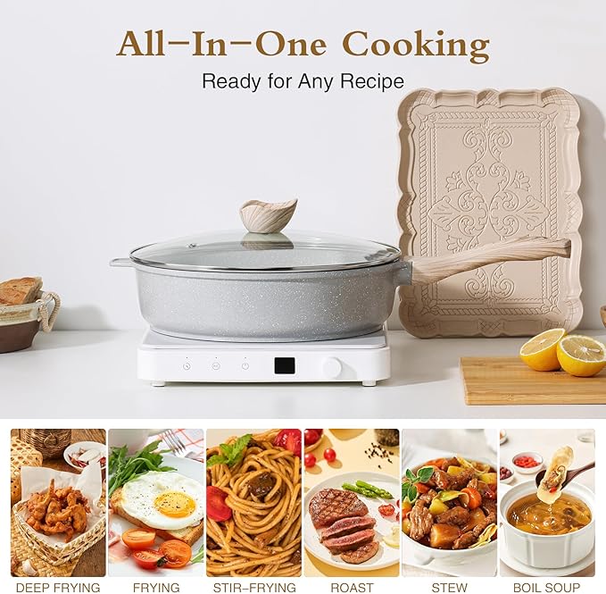 - 【Versatile Saute Pan with Lid】: Experience the convenience of our 11" diameter, 3" height, and 4.3 quarts capacity ceramic cookware; this large and deep skillet, also functioning as a deep frying pan and induction frying pan, is perfect for stir-frying, frying, boiling and deep-frying a variety of dishes with ease