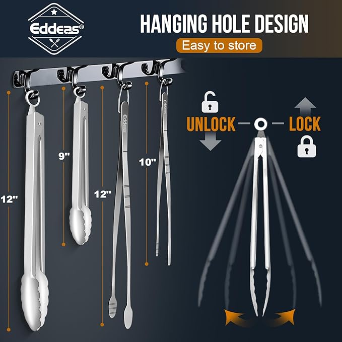 - MULTIPLE APPLICATION - 12 in + 9 in kitchen tongs & 12 in + 10 in cooking tweezers for everyday kitchen tasks or outdoor use, whether you use them as cooking tongs , salad tongs, grill tongs, need reliable Heavy Duty Metal KitchenTongs for Cooking to grab food from boiling water, or as a grill Turner or salad server, EDDEAS tongs will meet your needs for safety and stability