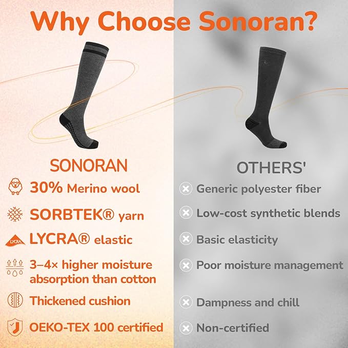 - Service:Elevate your daily routine with SONORAN merino wool compression socks. Indulge in the comfort and style they offer a gift for your loved one or for yourself, packaged in eco-friendly drawer-style paper tubes. With a generous one-year warranty, we prioritize customer satisfaction. Rediscover true feet care with our merino wool compression socks.