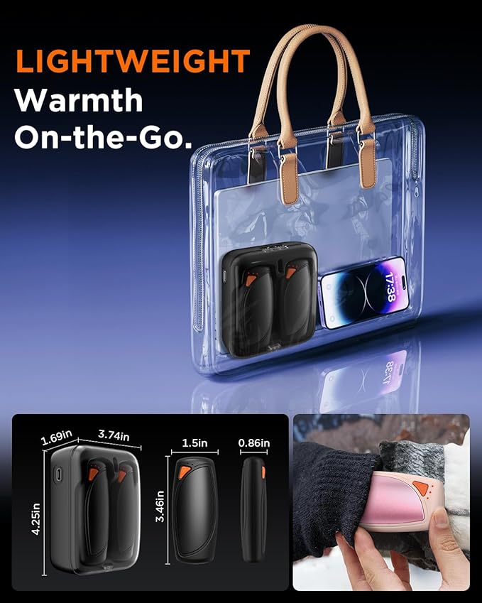 - ULTRA LIGHTWEIGHT AND PORTABLE: Each rechargeable hand warmer weighs only 1.9 oz with a slim 0.86" thickness. At just a quarter the size and weight of bulky, one-handed warmers, VIMWING easily slips into your pocket or gloves, providing warmth on the go without added bulk.