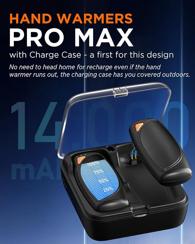 - HAND WARMERS PRO MAX WITH CHARGE CASE: VIMWING hand warmers set includes 2x 2,000mAh hand warmers and a 10,000mAh rechargeable charging case, allowing you to recharge your dual hand warmers 1.7 times on the go. Enjoy extended warmth without worrying about running out of power during outdoor activities like golfing, hiking, hunting, etc.