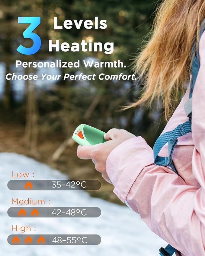 - 3 HEAT SETTINGS, 1-SECOND RAPID WARM-UP: 3 heat levels ranging from 95°F to 138°F to perfectly match varying weather conditions and personal comfort. Just like holding a warm cup of coffee, VIMWING battery-powered hand warmer delivers that same comforting warmth in just 1 second, keeping your hands cozy and comfortable.