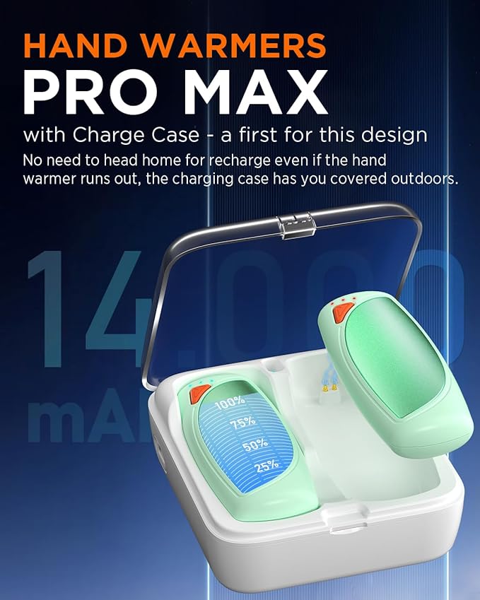 Hand Warmers Rechargeable with Charge Case, 2 Packs 14,000mAh Electric Hand Warmer Battery Powered Dual Sided Reusable Long Battery Life Portable Pocket Heater Gifts for Men Women Golf, Hunting Gear