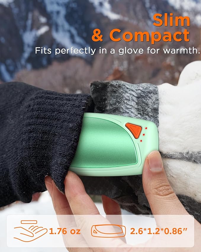 - ULTRA LIGHTWEIGHT AND PORTABLE: Each rechargeable hand warmer weighs only 1.9 oz with a slim 0.86" thickness. At just a quarter the size and weight of bulky, one-handed warmers, VIMWING easily slips into your pocket or gloves, providing warmth on the go without added bulk.