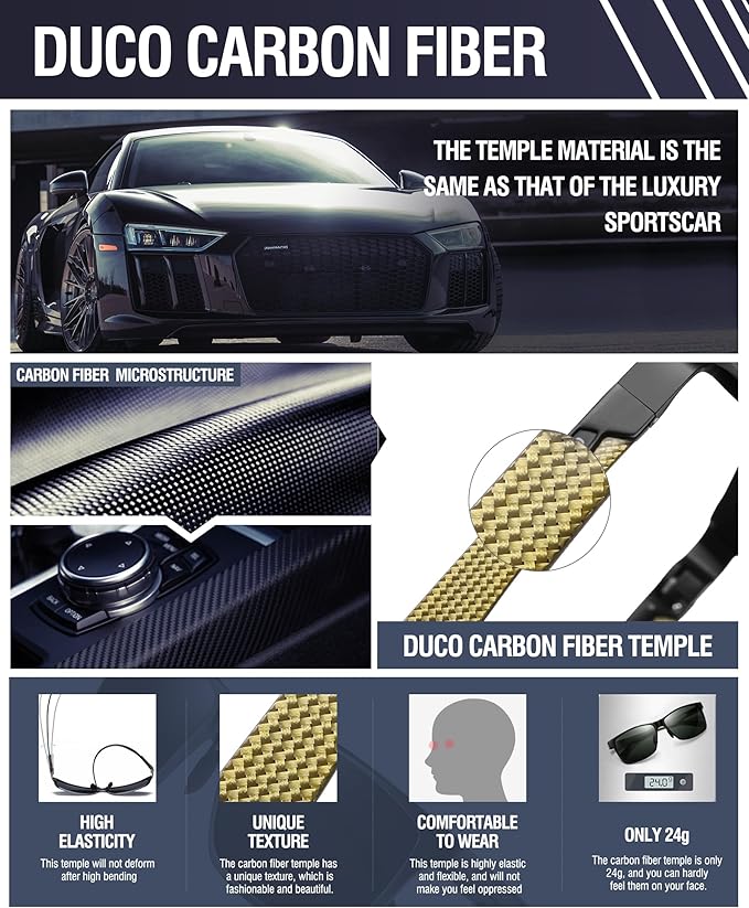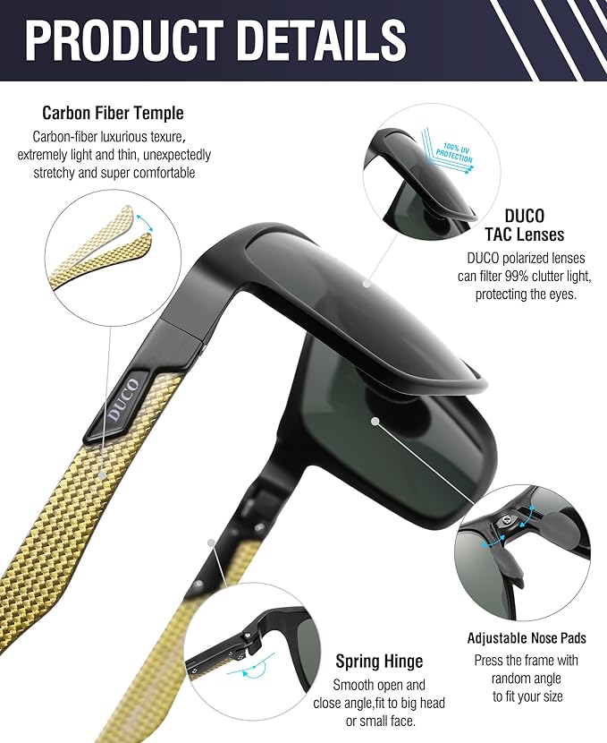 - 【UV HD Polarized Lenses】DUCO High Definition TAC Lenses Are Designed To Filter Out 99% Of Reflected Glare Minus The Haze And Distortion That Typically Comes With Conventionally. They Are Extremely Impact-Resistant, Scratch-Resistant, Lightweight And Durable. They Block 100% Of Harmful UVA, UVB & UVC Rays Up To 400nm, Restore True Color, Enhance Contrast, Make Your Eyes More Comfortable.