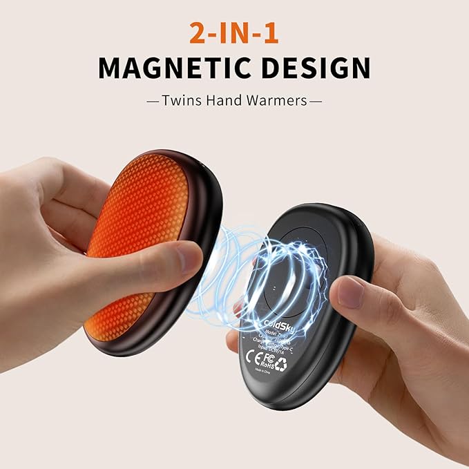 - 【2-IN-1 Reusable Hand Warmer】Our hand warmer's strong magnetic feature allows it to easily attach to metal surfaces or to each other. Two in one for all-round warmth, use separately to warm both hands at the same time. This rechargeable hand warmer brings warmth and comfort to every day while friendly to the environment.