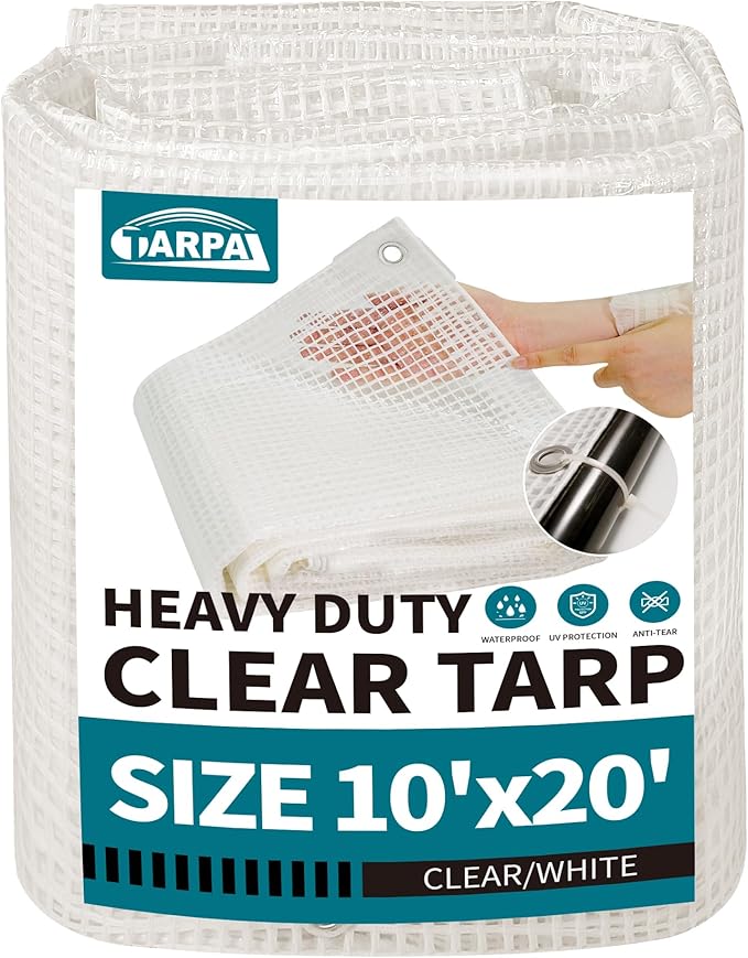 - 【12mil Heavy Duty Clear White Tarp】 Our clear white tarp is made of high quality polyethylene material. Clear tarp Waterproof is soft, easy to fold, not easy to deformation, reusable, Tarp cold, snow, water, dust, UV protection.