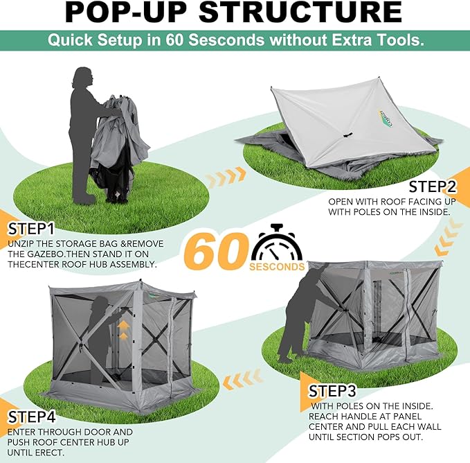 - ✅【Comprehensive Packing List & Warranty】 Your purchase includes 1 Tent Gazebo with Frame, 1 Upgraded Carrying Bag, 2 Door Frame Poles, 8 Stakes, 4 Ropes, and a User Guide. If any accessories are missing or damaged, please contact our customer service for prompt replacement. Note please: Upon first opening, the screen tent may appear inside out. This is intentional for compact storage. Do not attempt to reverse it, as it may cause damage to the gazebo.