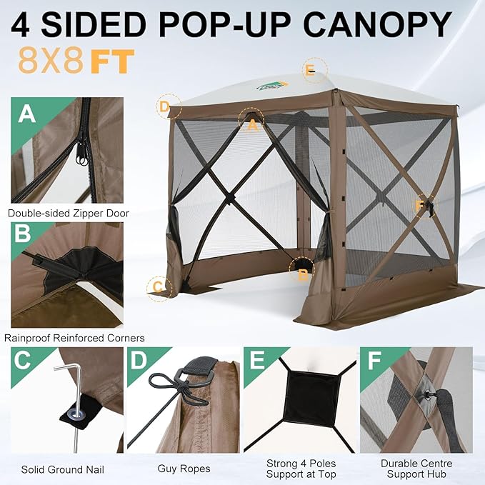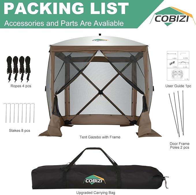 - ✅【Comprehensive Packing List & Warranty】 Your purchase includes 1 Tent Gazebo with Frame, 1 Upgraded Carrying Bag, 2 Door Frame Poles, 8 Stakes, 4 Ropes, and a User Guide. If any accessories are missing or damaged, please contact our customer service for prompt replacement. Note please: Upon first opening, the screen tent may appear inside out. This is intentional for compact storage. Do not attempt to reverse it, as it may cause damage to the gazebo.