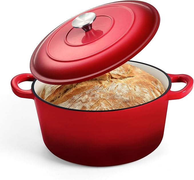 P&P CHEF 5QT Enameled Dutch Oven, Cast Iron Dutch Oven Pot with Lid for Bread Baking, Enameled Casserole Pot for Roasting Braising Stewing Frying Simmering, Various Stoves & Easy Clean, Red