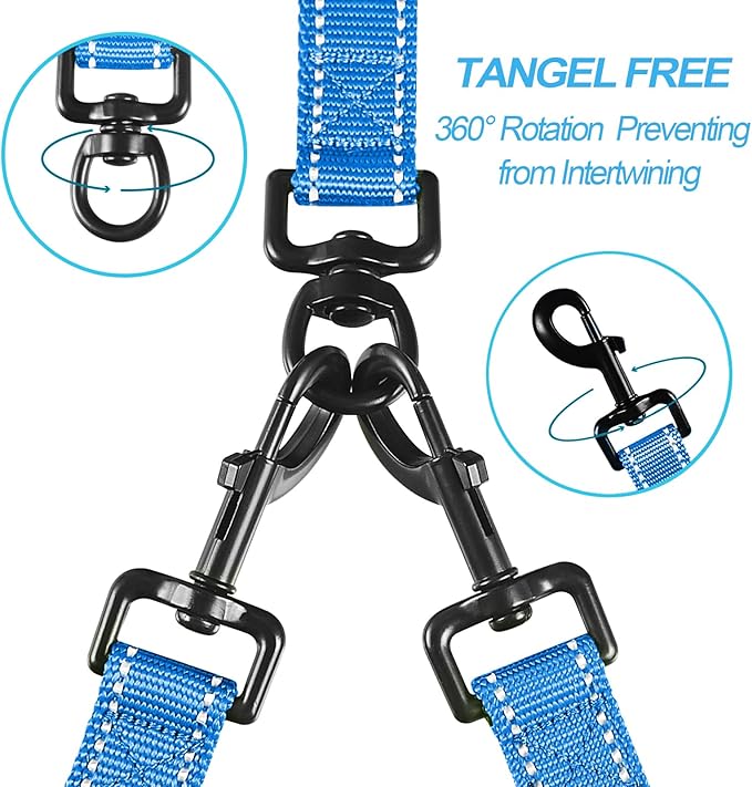 - No Tangle Double Dog Leash: 360° swivel clasps help to keep your dogs from getting tangled together. No need to worry about getting twisted two dog leash when dogs switch sides