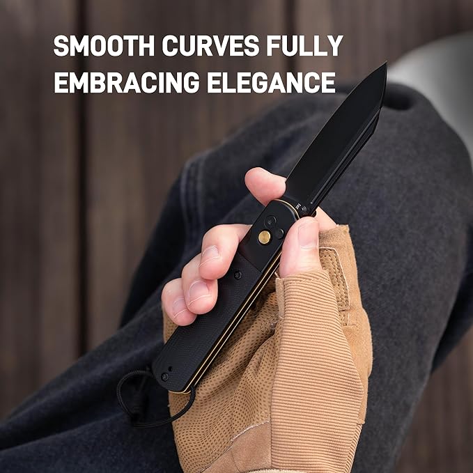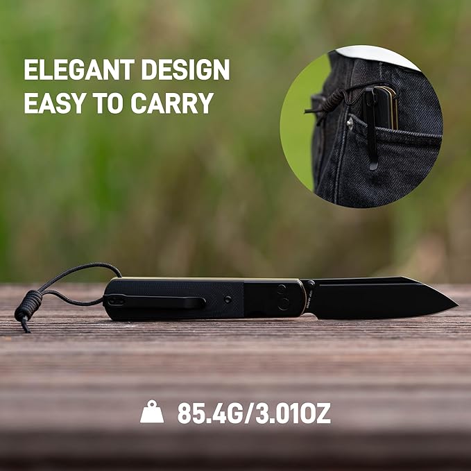 - Sleek Design and Precision Cutting: This pocket knife features a 3.10" AR-RPM9 Wharncliffe blade with a refined flat grind. Weighing just 3.01 oz, its Black PVD Steel and G10 Inlay inlay handle offers both elegance and practicality. Ideal for everyday carry