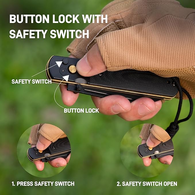 - Ergonomic One-Handed Design: The pocket knife is designed for comfortable one-handed operation, offering effortless control with safety. The Button Lock allows smooth handling, and the Safety Switch adds reassurance during use, ideal for various tasks