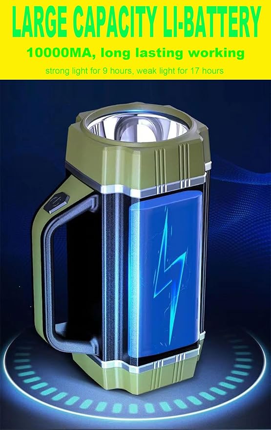 - LARGE CAPACITY POWERFUL LED LIGHT LANTERN: Built-in rechargeable high-capacity lithium battery ( 10000MA ), if fully charged, can be lighting in high light for 9 hours, weak light can be lighting for 17 hours. With over-current protection circuit to ensure the service life of the battery