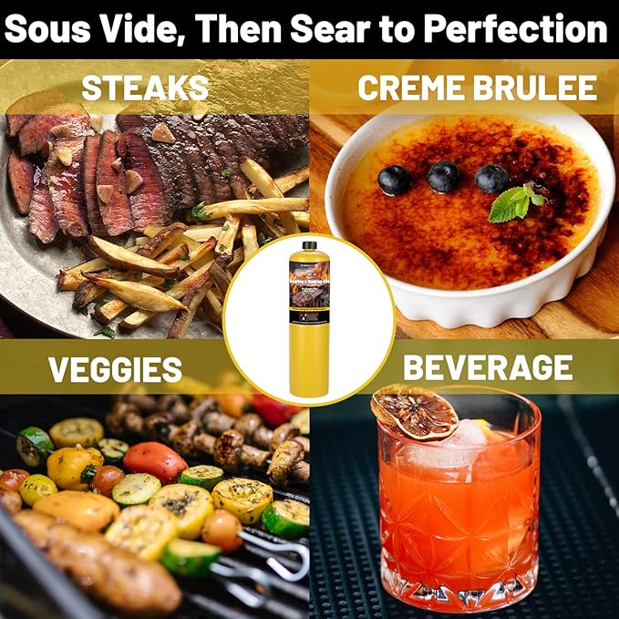- 【Perfect Cooking Torch】KookCook Cooking Torch is featured with Super High heat output & much Hotter than Butane Kitchen Torches, high temperature enables the Maillard effects within short time while lock nutrition & flavor inside. With max temperature up to 2372°F, it makes searing jobs super easy and quick. When you are grilling meats & veggies; broiling Sous Vide; caramelizing & baking Crème Brûlée or desserts, KookCook Grill Gun always make your foods Crispy Outside, Tender & Juicy Inside!