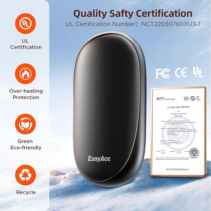 - 【Safety Hand Warmers】EasyACC hand warmer OT-93 reusable handwarmers is UL certified (Report Number: NCT22030760XU3-1, ensuring that it meets the highest safety and quality standards; unlike other products that only have UL reports, this raynauds hand warmer has been rigorously factory tested to ensure true safety; this rechargeable hand warmer is your reliable companion for comfort and warmth.