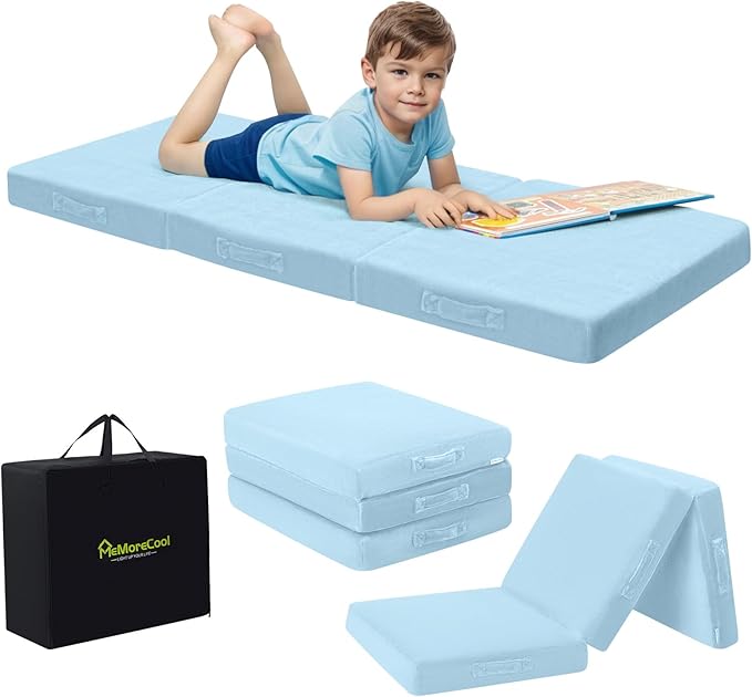 MeMoreCool Foldable Floor Mattress for Kids, Toddler Floor Nap Mat for Sleeping Daycare, Small Child Foldable Mattress Floor Bed, Trifold Futon Portable Tri Folding Mattress, Blue 57x22 Inch