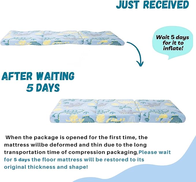 - [Let It Inflate More Than 72 Hours] When the package is opened, the kids folding mattress will be deformed and thin due to compression packaging. Please wait for 3 days, then the toddler foldable mattress will be restored to its original thickness and shape! If you want to regain the thickness more quickly, please use a garment steamer, to bring the foam back to its actual height and remove wrinkles from the cover