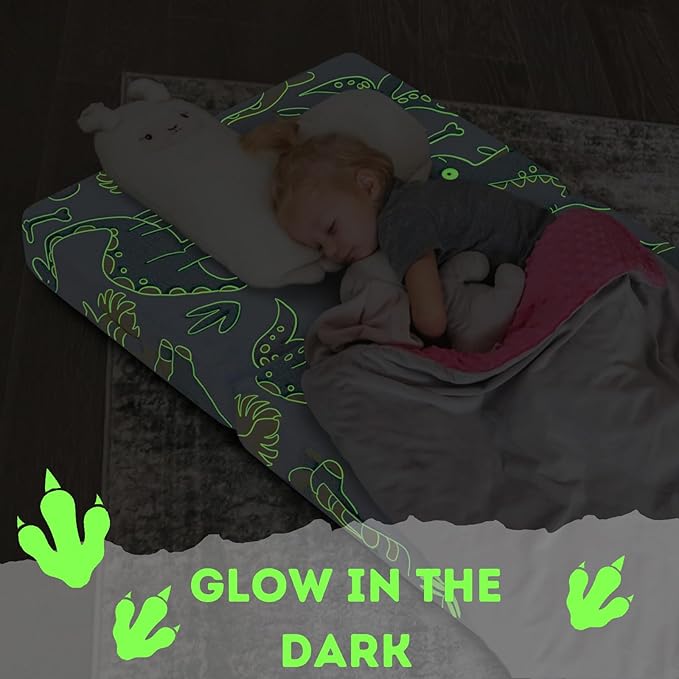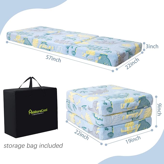 MeMoreCool Foldable Floor Mattress for Kids, Glow Dinosaur Trifold Nap Mat for Toddlers, Portable Sleeping Futon for Daycare or Floor Bed, 57x22 Inch