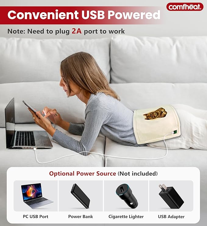 - CONVENIENT USB DESIGN, USE ANYWHERE: Our USB pulg-in heating pad is 12 "x16"; Comes with a 5.9 feet long USB cord, compatible with 5V 2A USB outlets, such as your own power bank, USB adapters, etc; This makes it easy to use in a variety of situations such as camping, fishing, stadiums or in airplanes