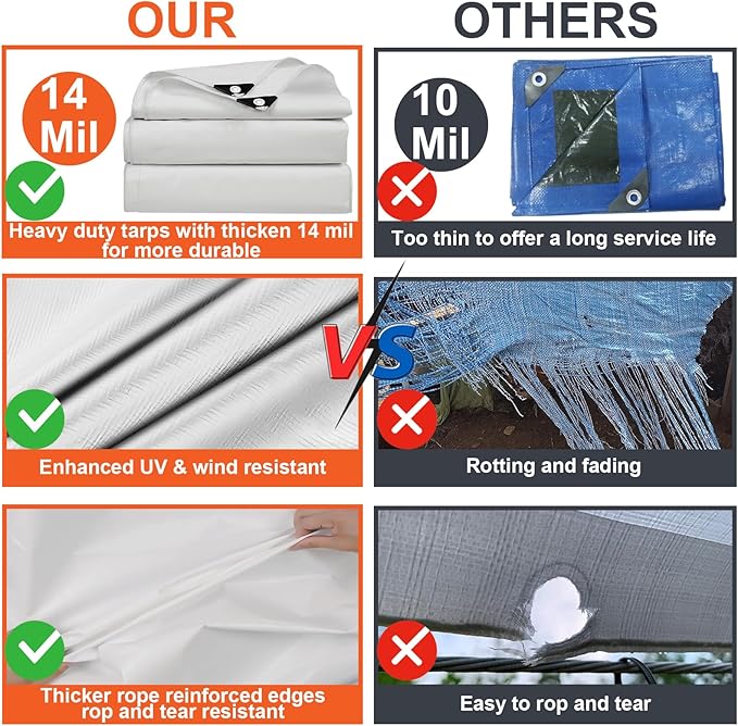 - MULTIPURPOSE USE: This poly tarp cover serves a multitude of purposes, it suits for covering various objects such as roofs, boats, pools, and outdoor furniture. Additionally, it can be utilized to create canopy tent tarp or camping tarp, facilitate camping adventures, provide floor protection during painting projects, and so much more. If you have any problem about our tarp, please contact us. We provide 12 months after-sales service, 100% satisfaction for no risk shopping!