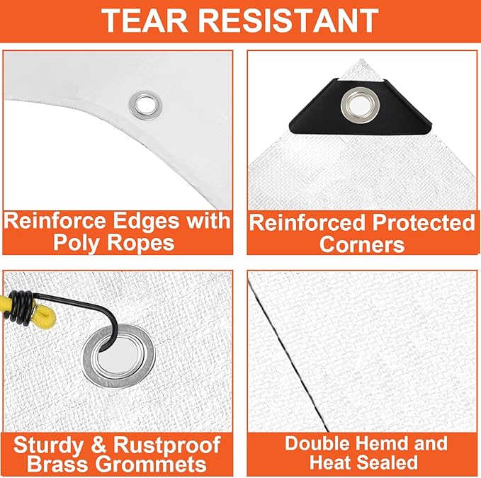- STRONG GROMMETS + REINFORCED EDGES & CORNERS: Our plastic tarp features reinforced edges with sturdy aluminum grommets every 23.6 inches, allowing for secure tie-downs and easy installation. The hem is double hemmed, heat sealed and reinforced with poly rope to provide additional support. Extra reinforced plastic corners can prevent wear and tear, extend life of tarps