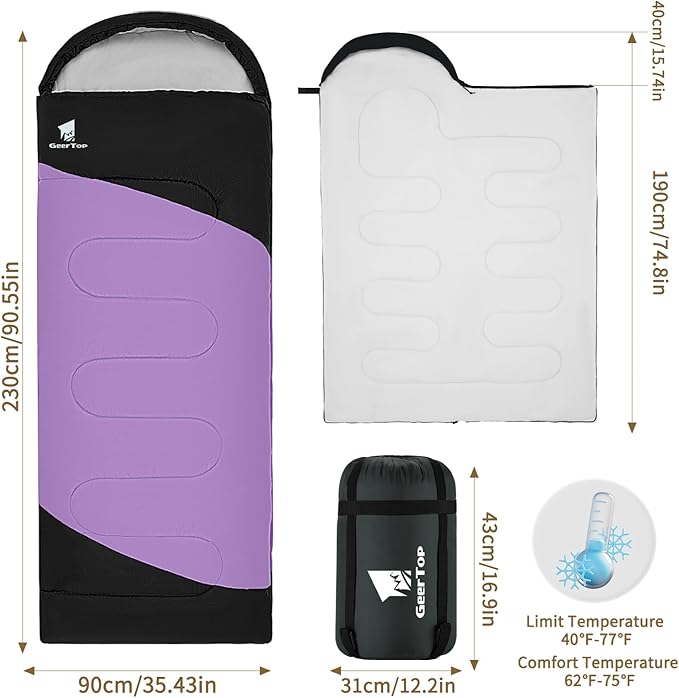 - 【Sleeping Bag for Adults and Kids】Using size - 90.5‘’(L) x 35.4" (W) , comfortable sleeping bag size for adults, and it is spacious for kids or teenagers. Enjoy a good night's sleep with this sleeping bag in your camping trip. Comfort temperature is 62°F - 75°F. Limit temperature is 40°F - 77°F.