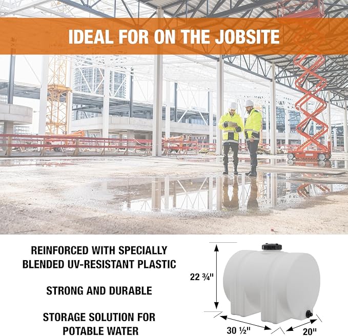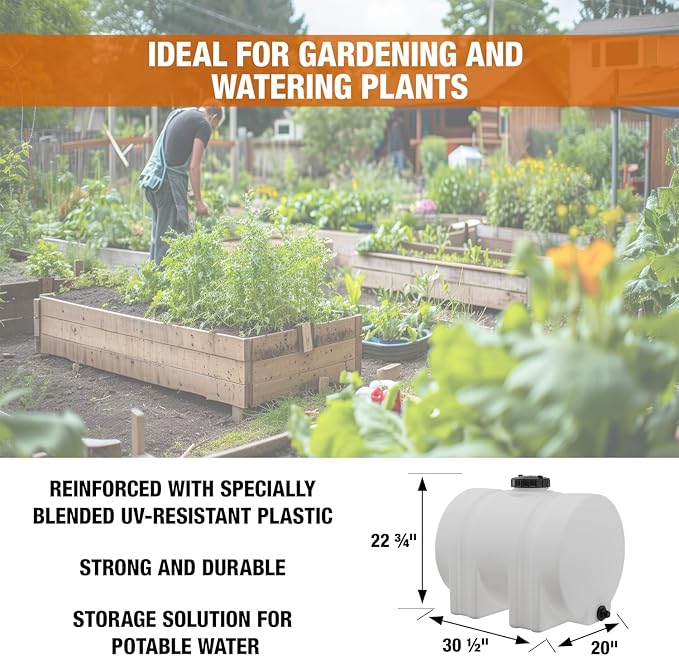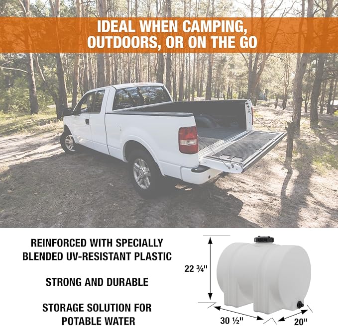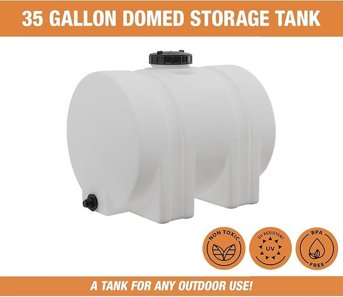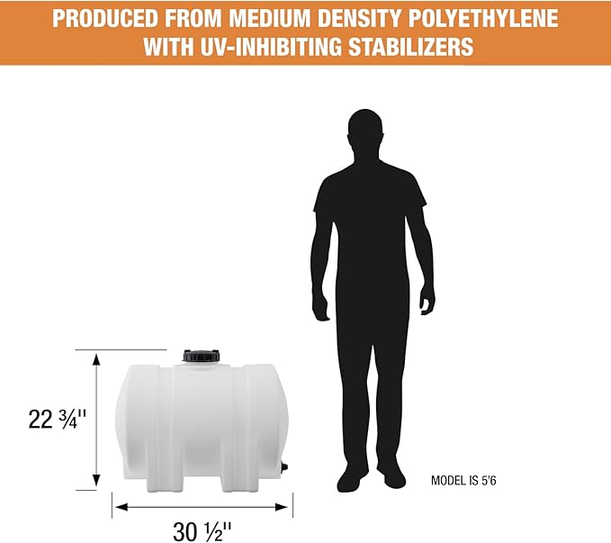 Romotech 82126189 Horizontal Polyethylene Reservoir Water Tank w/Legs, 35 gal, Made In USA, Natural Poly Tank For Non-Flammable Liquids, UV-Resistant, Ideal for Agricultural Use, RV Water Storage