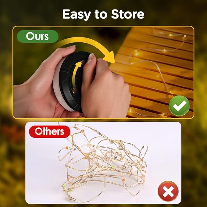 - Portable Storage: The camping light is only 7.4 ounces, very lightweight and portable, it can be easily put into a backpack or handheld device, a quick turn of the handle and the manual device ,32.8FT string lights can resume the camping light in only 30 seconds. The clever design of the string lights for camping ensures portable storage. Undoubtedly a camping essentials.