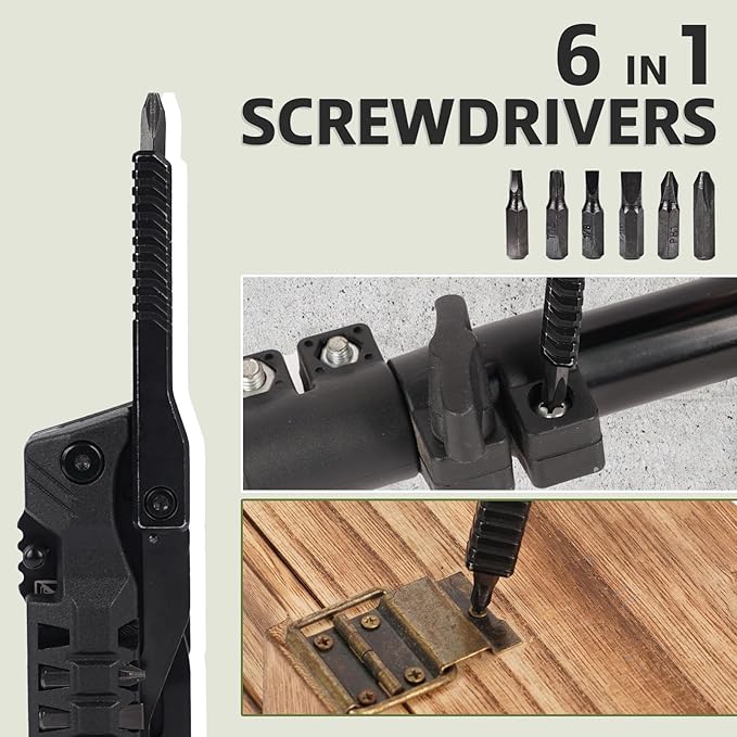 - Versatile and Handy: 21-in-1 multitool camping knife includes knife, saw, rope cutter, 6-in-1 screwdriver bit, bottle/can opener, L-shaped screwdrivers set, fire starter, window breaker, whistle, Fliestone; Perfect for outdoor enthusiasts, handymen