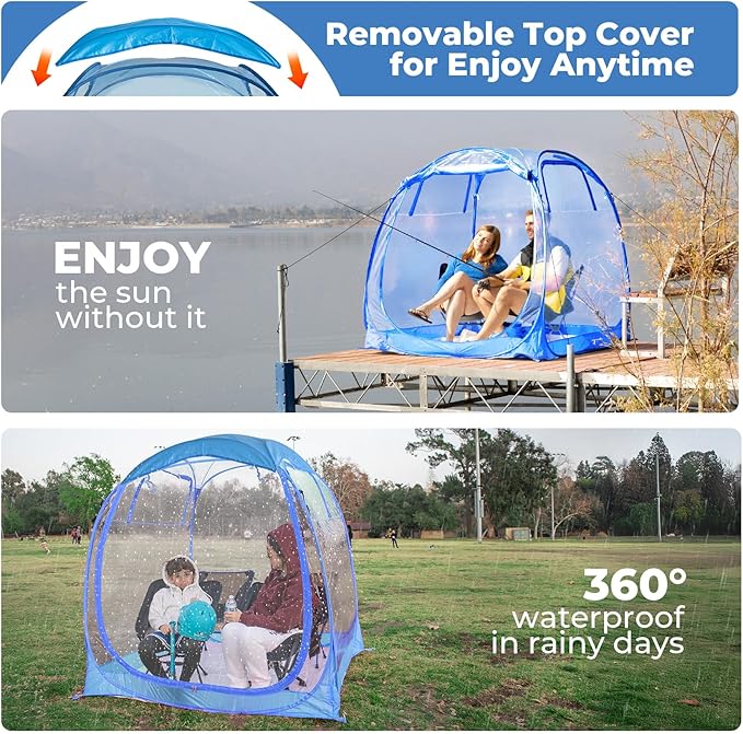 - 【Removable Top Cover for Anytime】By removing the top cover, you can enjoy additional sun protection to help maintain your temperature during cold weather. During bad weather, your new outdoor sports pod with a top cover can prevent water from entering the tent through the top to the greatest extent and protect you from the wind and rain.