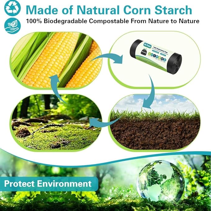 - Biodegradable and Compostable: Our portable potty bags is made of plant-based materials, the camping toilet bags can completely decompose in 60-180 day, then portable toilet bags become a part of soil. Using compostable human poop bags will not pollute the environment.