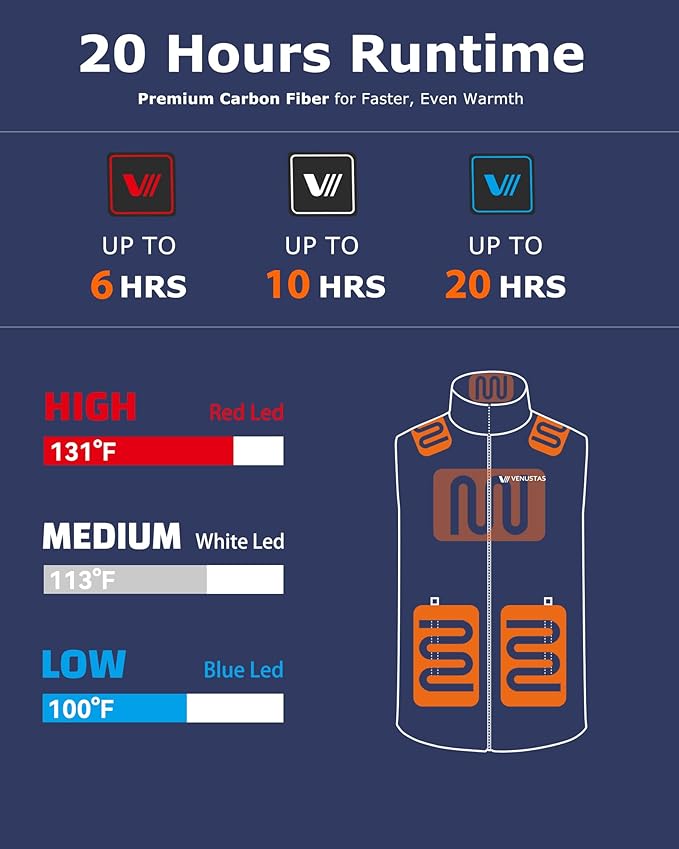 • Up to 20H Runtime: Venustas heated vest with battery pack 10,000mAh included provides up to 20 hours of continuous warmth with ALL 6 heating elements working, engineered for longest lasting warmth in harsh cold conditions.