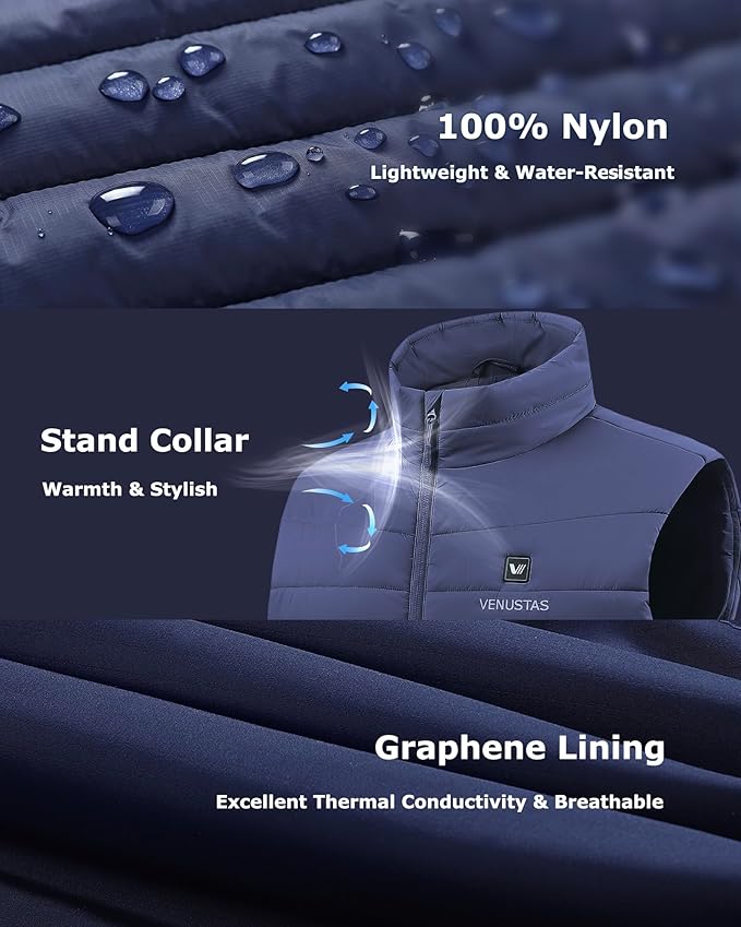 • 30% Larger Heating Areas: This heating vest follows the design of venustas classic men's heated vest, and equipped with 6 heating zones, which is 30% larger than most product on the market. Collar heating protects the neck from the freezing cold. 3 temperature mode adjustable, with a maximum of 131℉ on high.