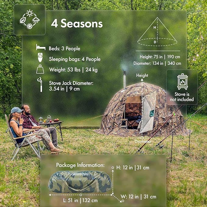 - Included Components : Bag, Fixing bolt, Spare parts kit, Heat-resistant wal, Detachable organizer, Pegs, Transparent velcro window, Tent, Stove, Dome net shelf, Warm Floor, Swing door, Tension rope Bag, Fixing bolt, Spare parts kit, Heat-resistant wal, Detachable organizer, Pegs, Transparent velcro window, Tent, Stove, Dome net shelf, Warm Floor, Swing door, Tension rope