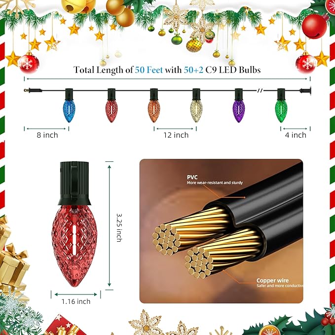 - Easy to Use: This 50 foot long C9 Christmas lights is compatible with C9/E17 bases and comes with 50 colorful bulbs. Two spare bulbs are included for replacement. Each bulb has a power rating of 1 watt, making the total power consumption of the string 50 watts, suitable for 120V power supply. Both the C9 bulbs and filaments are easily detachable or replaceable, making operation simple and allowing you to effortlessly enjoy the festive ambiance created by the christmas string lights for outside.
