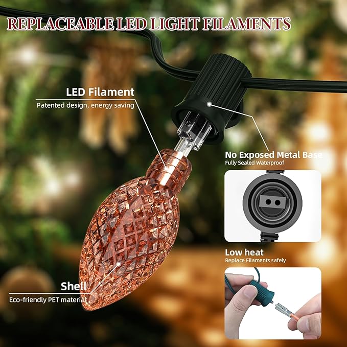 - Energy-saving LED Strawberry Christmas Lights: The C9 outdoor Led light string features a patented design LED filament, known for its high efficiency and energy-saving characteristics. Compared to incandescent bulbs with tungsten filaments, it can save up to 90% energy per hour. With a lifespan of up to 30,000 hours, it offers sustainable and long-lasting illumination.