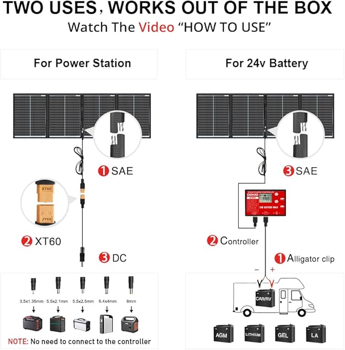 - 【All-in-One Kit with Accessories】Includes 200W folding panel, PWM controller, 9.8 ft (3 m) cable, 3.3 ft (1 m) cable, adapters, and manual. Optional 19.7 ft (6 m) XT60 extension cable and mounting bracket available separately.