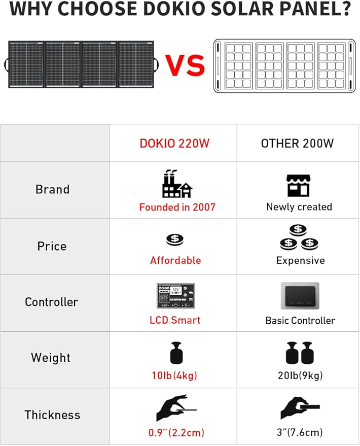 DOKIO 200W 36V Portable Folding Solar Panel Kit for 24V Batteries & Power Stations Lightweight Flexible Charger for AGM, LiFePO4, Deep Cycle — RV, Trailer, Truck, Boat, Camping, Van, Emergency