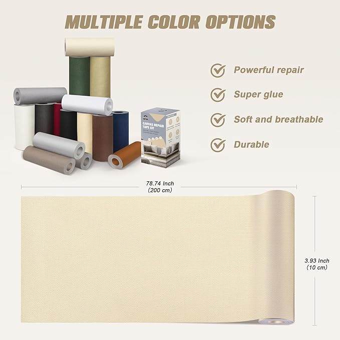 - 【DIY】Self adhesive canvas repair patch is super durable and safe to use, making it very suitable for repairing various outdoor canvas fabric products. The size of each fabric repair tape is approximately 4 x79 inches, with a variety of colors. You can choose the appropriate color according to your needs to DIY cut your favorite pattern