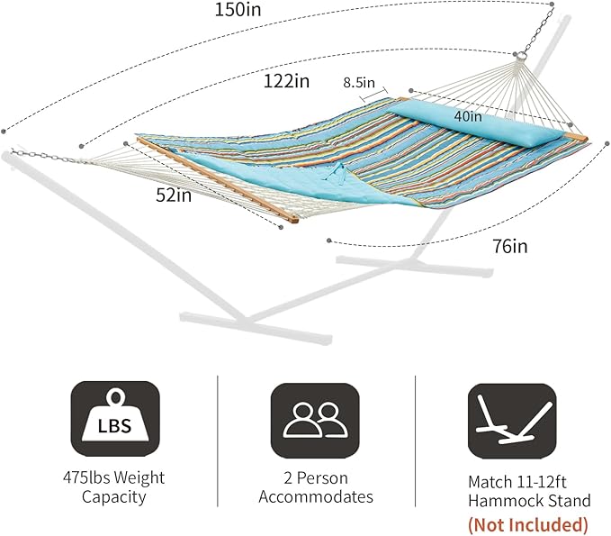 - Large 2 person Hammock: Rope hammock bed size: 76"L*52"W,hammock pad size:78"L* 55"W.Designed to support up to 475 lbs,the hammock fits 2 adults comfortably. It's time to share the hammock with your family.The ring-to-ring length is 122inches, equipped with two 14” metal chains, the maximum length of the rope hammock can be up to 150inches, fits 11-12ft hammock stand(not included).
