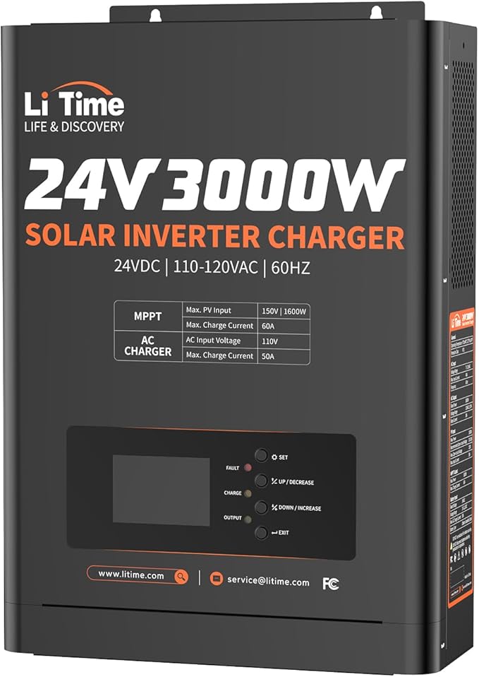 - High-Performance Solar Inverter Charger: The LiTime 24V 3000W All-in-One Solar Inverter Charger is the ultimate solution for Home Energy Storage and Off-Grid Solar Systems, integrating an MPPT Solar Controller, inverter, and charger in one unit(Supporting 9000W surge). Achieve auto photovoltaic tracking and pure sine wave output, ensuring stable and efficient energy conversion and usage. This product is ideal for Home Energy Storage, and Off-Grid applications.